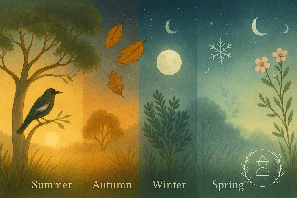 Honouring First Nations Wisdom – Long before imported festivals arrived on these shores, the First Nations peoples of Australia lived in deep relationship with the land, guided by intricate seasonal calendars that varied by region and Country. These cycles were not just about weather, but about the movement of animals, flowering of plants, and the rhythms of life. As we seek to reconnect with our own seasonal truth, we do so with deep respect for the custodians of this land, whose knowledge systems have honoured these cycles for tens of thousands of years.